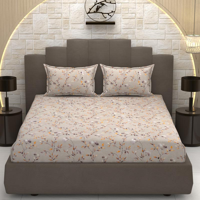 Floral Print Beige Colour Glace Cotton 160TC Queen Size Double Bedsheet with 2 Pillow Covers