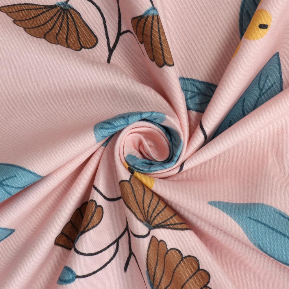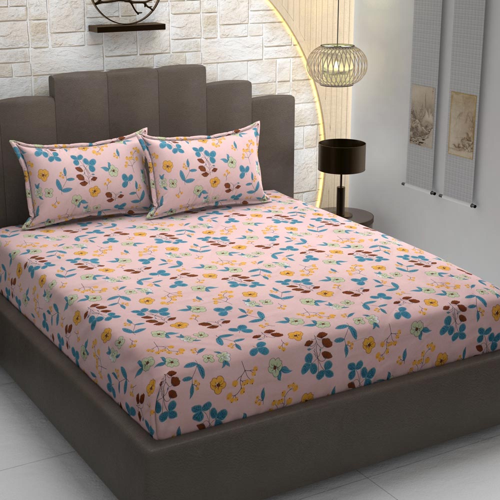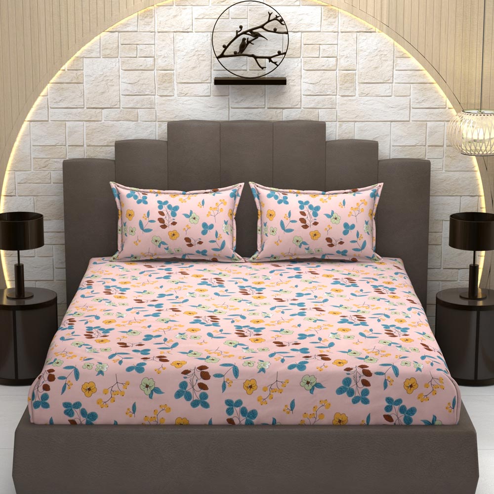 Floral Print Pink Colour Glace Cotton 160TC Queen Size Double Bedsheet with 2 Pillow Covers