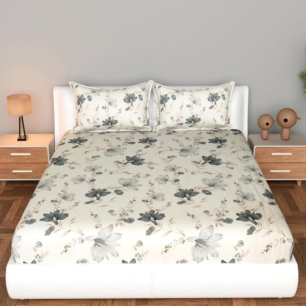 Floral Print White Colour Glace Cotton 160TC Queen Size Double Bedsheet with 2 Pillow Covers